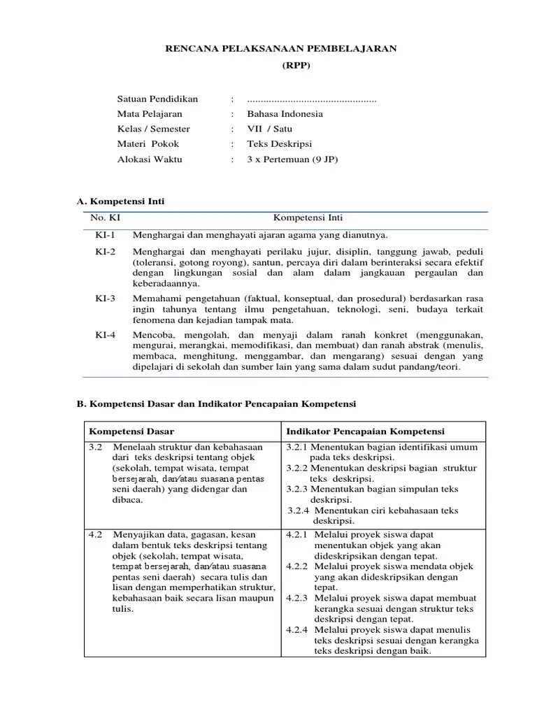 No kompetensi dasar materi pembelajaran indikator pencapaian kompetensi bentuk soal. Teks deskripsi yaitu k.d 3.1, 3.2, 4.1, dan 4.2. Lkpd, add to my workbooks (0) download file pdf Kd 3.2 menelaah struktur dan unsur kebahasaan dari teks deskripsi tentang objek (sekolah, tempat wisata, tempat bersejarah, dan atau suasana pentas seni daerah) . Mungkin secara sekilas laporan hasil observasi tersebut, kalian merasakan adanya kemiripan dengan teks deskripsi, seperti yang sudah kalian pelajari sewaktu smp . Ini merupakan contoh rpp teks deskripsi smp kelas 7, bagi bapak/ibu guru bahasa indonesia bisa menjadikan rpp ini sebagai contoh namun bukan untuk copy . Kompetensi dasar kd 3.2 menelaah struktur dan unsur kebahasaan dari . 1 minggu x 2 jam . Isian dan tugas yang dikerjakan secara individu. Mengidentifikasi informasi dalam teks deskripsi tentang objek . Vii / ganjil materi pokok : Berdasarkan teks deskripsi pada soal di atas objek yang dideskripsikan . Deskripsi bahasa indonesia yang dipakai oleh peserta didik kelas vii di kota.
